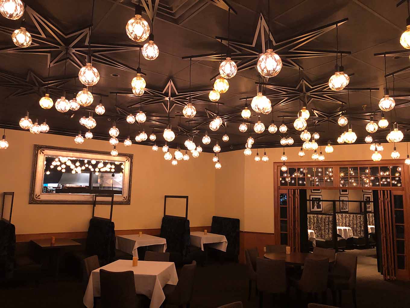 Another design of our custom star fixture mounted flush to the ceiling. Thicker geometric glass globe bulbs add a weight to the lighting. This creates a cozy and intimate atmosphere.