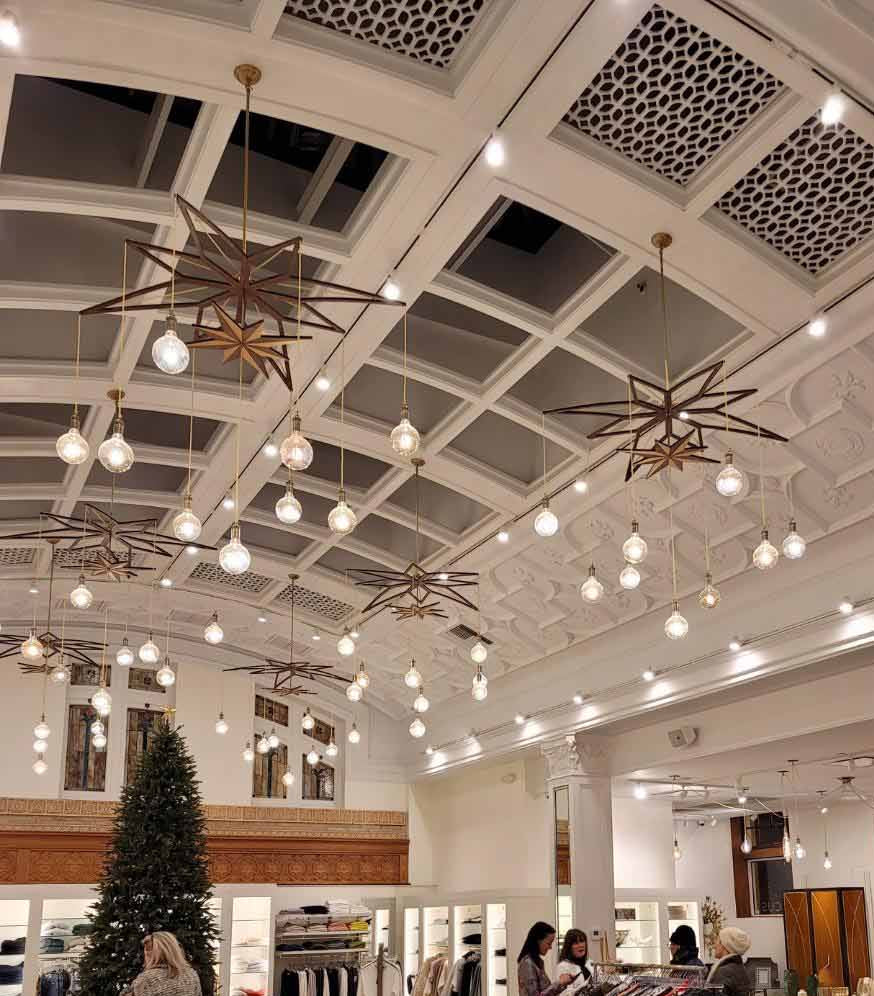 Laser cut wood star frames with gold cord pendant lights. This fixture was designed by Hangout Lighting for a gorgeous retail space outside of Chicago.