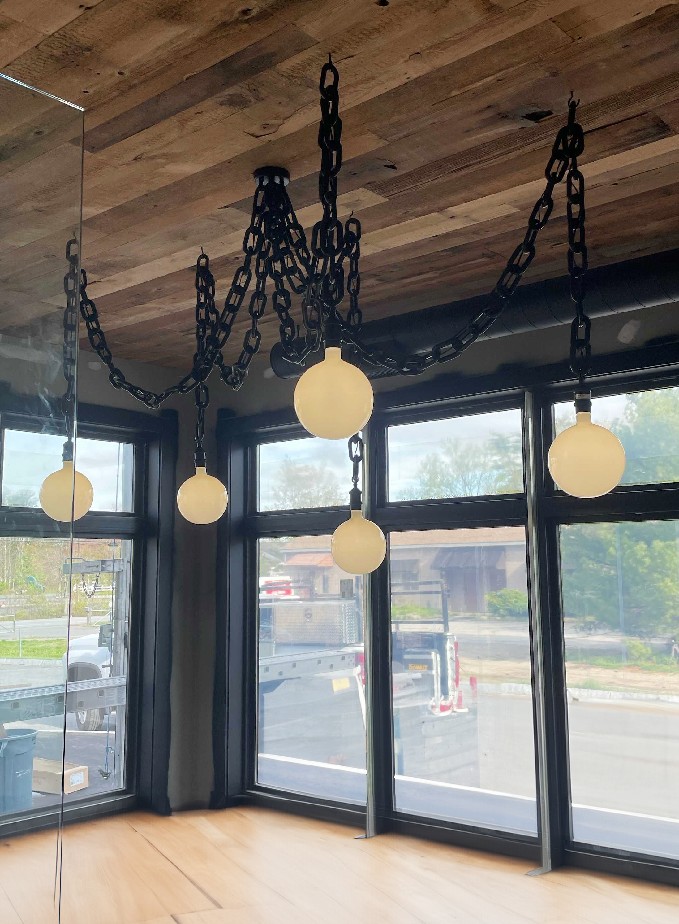 Oversized 4″ industrial chain paired with 8″ white LED globe bulbs creates a bold 5-pendant swag chandelier. Mounted to a wood ceiling, this custom design combines rustic strength with modern simplicity for striking dining or bar lighting.