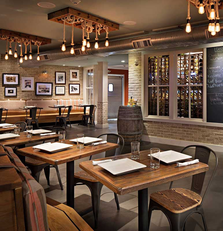 A customer-designed wood box with iron pipe rods becomes the base for seven rope pendants, wrapping and draping to create a warm, rustic restaurant dining room.