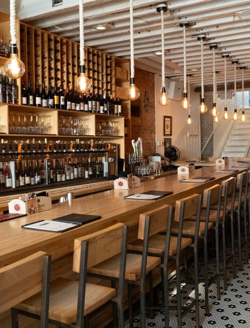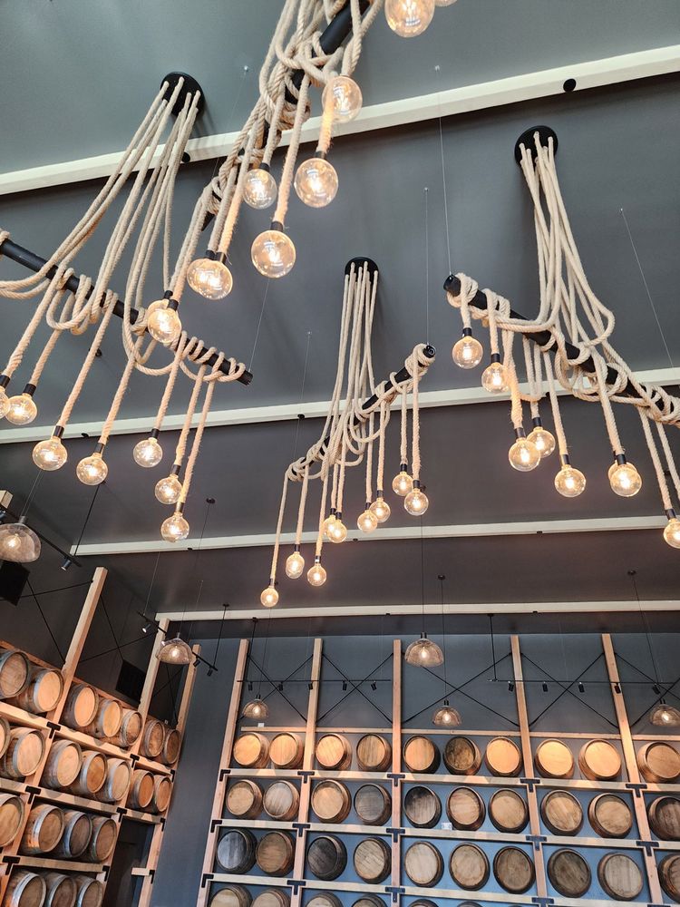 Rustic cotton rope pendants bring texture, warmth, and ambient glow to this wine bar—an inviting pendant lighting choice for restaurants, dining rooms, or bar spaces.