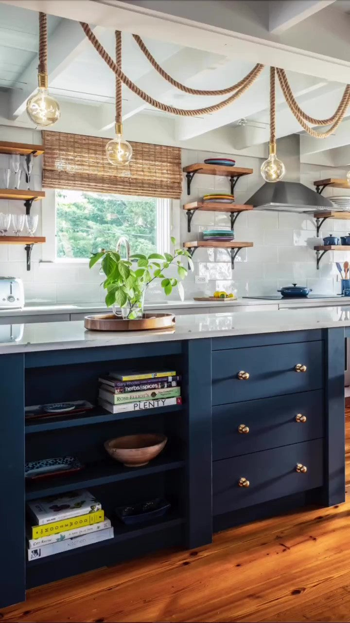 Five pendant rope swag with 5″ organic amber globes complete this nautical kitchen renovation, adding warmth and natural texture.