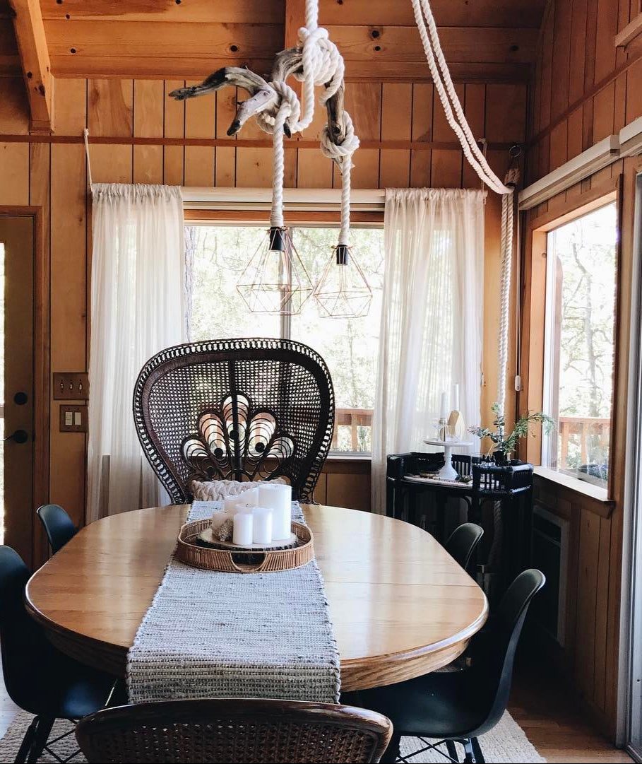 An industrial iron pipe forms the frame for this long linear dining light, with thick nautical rope pendants wrapped around to create a one-of-a-kind statement fixture