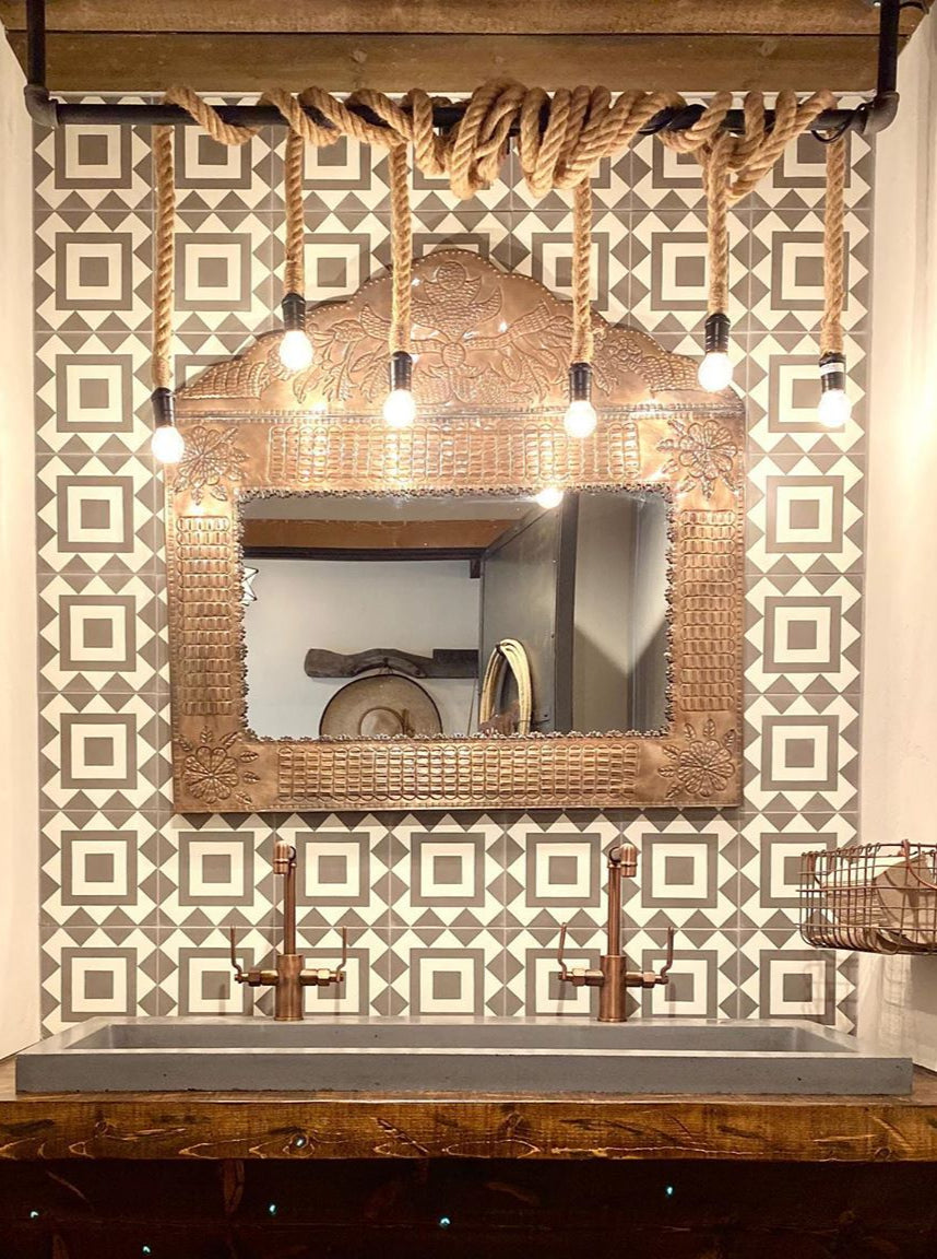 Unique Industrial Vanity Lighting - Rope Pendant Pipe Wrap. 6 pendants, natural manilla rope, over bathroom sink with copper accents.