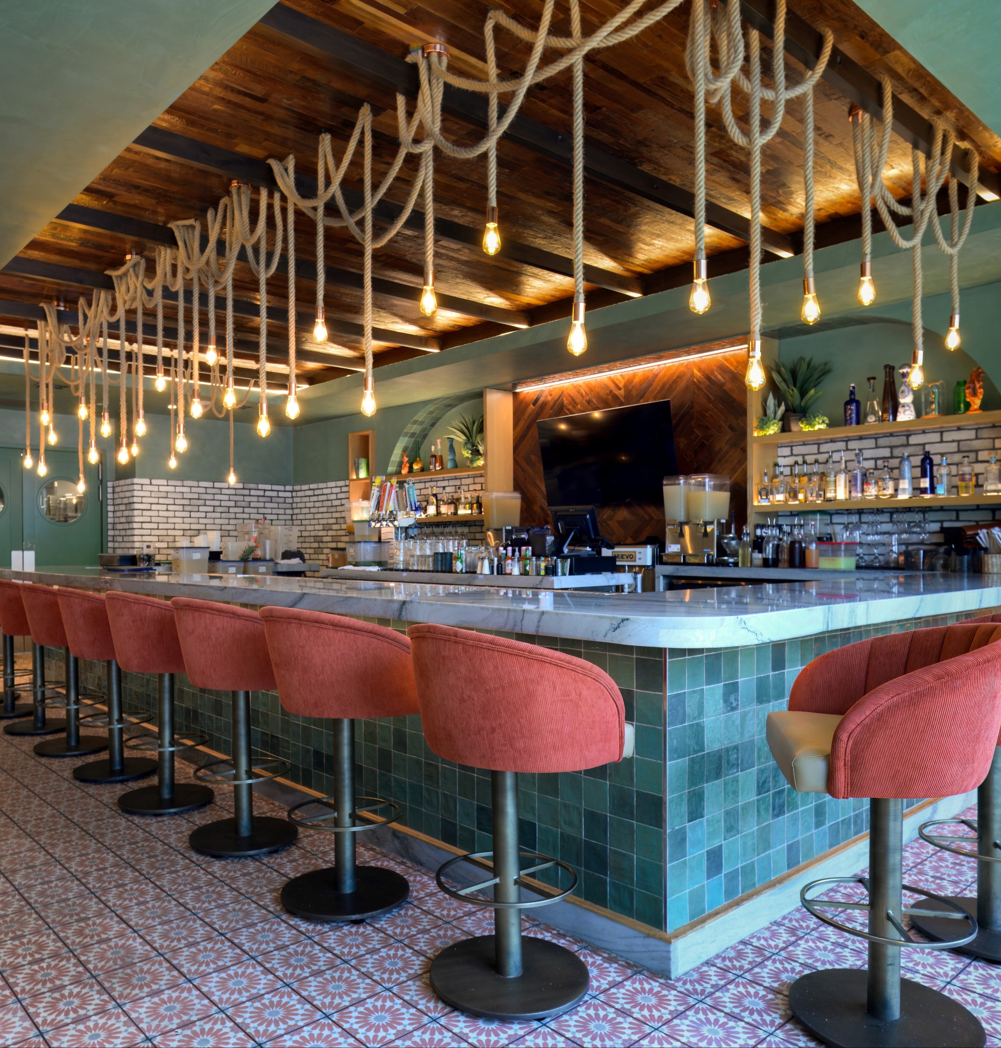 Showstopping bar lighting created with multiple 5-pendant rope swag fixtures, Edison bulbs, and copper accents.