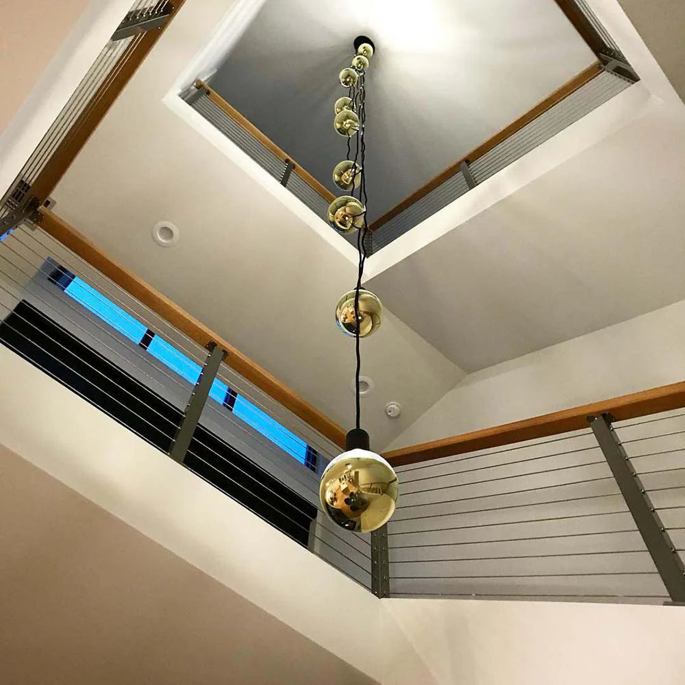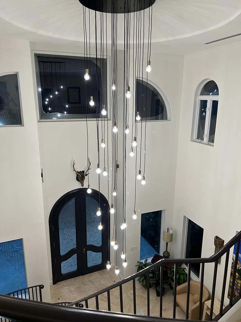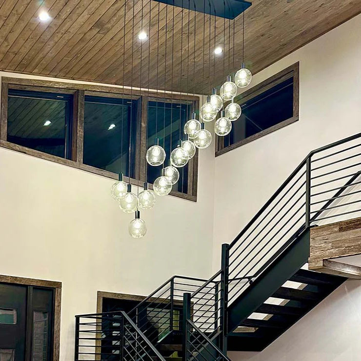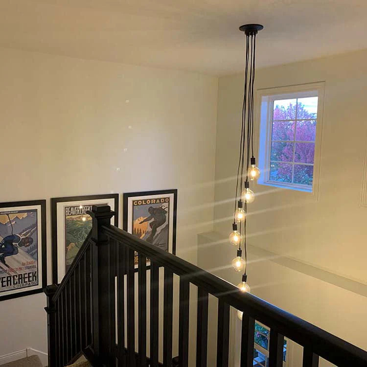 We offer custom drop lengths up to 15 feet (or more). You can mix pendant lengths to create a cascading effect that fills the vertical space beautifully, whether your stairwell is two stories or has a vaulted ceiling.