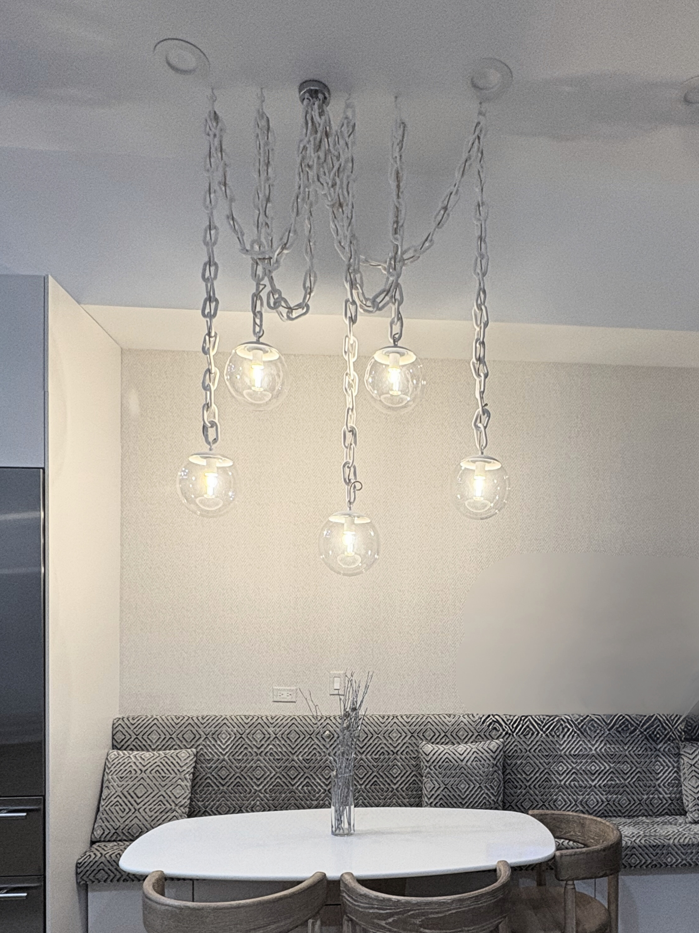 This chandelier is crafted using a durable polymer chain for lighter weight. It can be used for suspension and hand-blown glass globe shades for each pendant. The combination of heavy-duty chain and premium glass gives the fixture a bold, modern-industrial look while maintaining elegance.